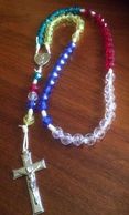 The World Mission Rosary was created by Archbishop Fulton J. Sheen. He published these prayers in February of 1951. The colors represent every continent of our world: Green/Africa, Red/North and South America, clear/Europe, Blue/ Australia and Oceana, yellow/Asia. The audio of these prayers were recorded by the Willow Grove Area Group of the Lay Missionaries of the Sacred Heart and their children.
